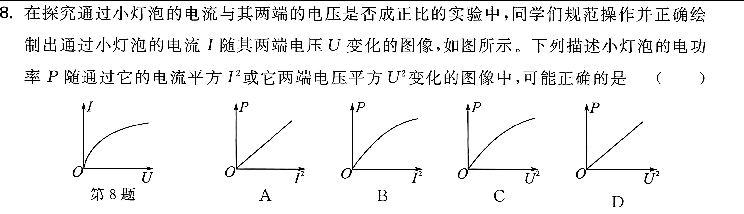 对于横坐标 $P$ ,我们可以展开为 $U$ 与 $I$ 的乘积,然后对于A选项和B选择这种类型,横坐标是 $I^2$ ,纵坐标是 $UI$ ,于是我萌生一种想法,是不是坐标轴的 $I$ 可以互相约掉,如果可以,那么约掉 $I$ 的坐标轴就是 $U$ 与 $I$ ,正好与原图像横纵坐标相反,于是得到这个图像与第八题给的图矛盾,正好横纵坐标颠倒了,所以错误了.